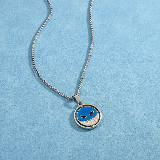 Inspired by the signature necklace worn by Portgas D. Ace, the Ace Necklace features two defining elements: a string of orange beads and two silver-tone pendants — one resembling a crossbones-like symbol (Ace’s personal sigil), and another of a smiley face with a frown/smile dual expression.