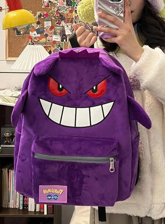 A Gengar backpack is a functional fashion piece inspired by the Ghost/Poison-type Pokémon Gengar, known for his mischievous nature and shadow-dwelling tricks. These backpacks often feature Gengar's iconic features: his purple body, sinister red eyes, toothy grin, and sometimes even 3D ears or spikes.