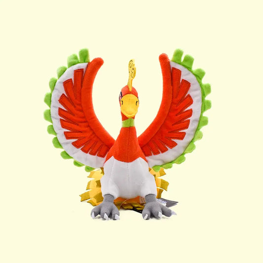 A divine symbol of rebirth and light, Ho-Oh soars in plush form as a radiant, regal centerpiece. Known as the Rainbow Pokémon, Ho-Oh’s mythic presence in the Pokémon universe is rivaled only by its beauty—and this plush version does not disappoint. With flowing crest feathers, wide majestic wings, and a flame-imbued tail, the Ho-Oh plush captures the essence of this legendary bird in every thread.