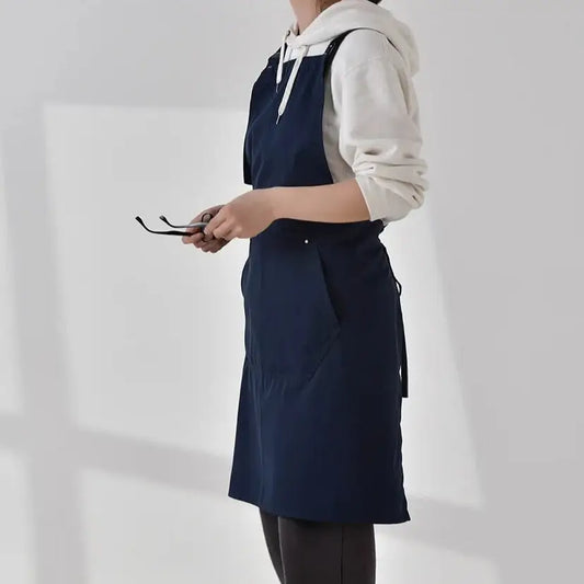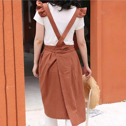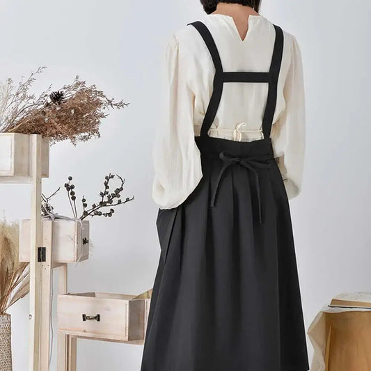 The Japanese Apron, also called a "kappogi" or "cross-back apron," is a no-tie, wrap-style apron known for its loose, comfortable fit and elegant drape. These aprons often forego the neck strap and waist ties of Western aprons in favor of wide shoulder straps that cross in the back, making them easy to slip on and off.