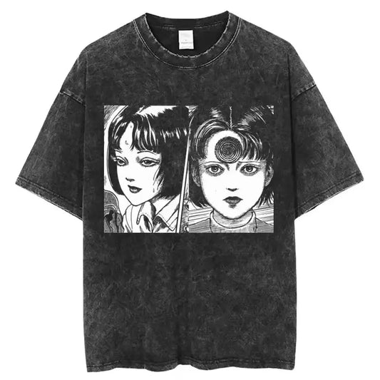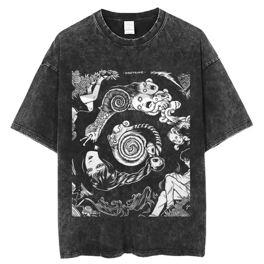 Junji Ito shirts are fashion garments that feature illustrations, characters, and scenes from the manga of legendary horror artist Junji Ito. These shirts pull directly from the source material, using detailed line art, grayscale tones, and haunting manga panels to create wearable horror art.