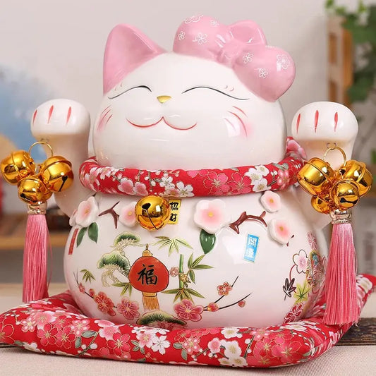 Traditional ceramic Lucky Cats bring timeless authenticity. Choose hand-painted models for a vintage shrine look. Pair with incense burners, bamboo arrangements, and red tassels for a fully immersive Japanese motif.