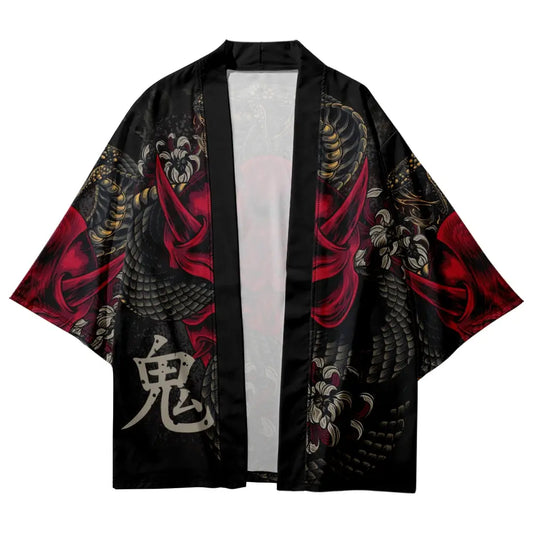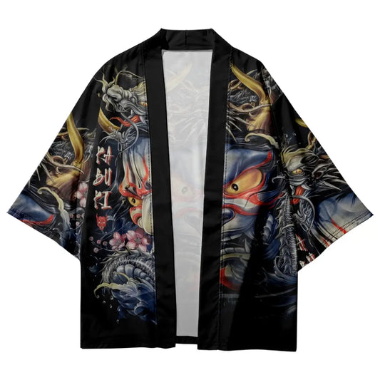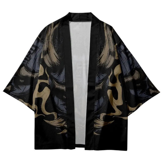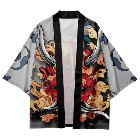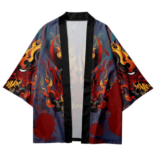 The Oni Haori is a fashion-forward fusion of tradition and terror, elegance and edge. In its simplest form, it is a knee-length Japanese-style jacket, open in the front, typically made of breathable and flowing fabrics like cotton blends, polyester-satin mixes, or even silk-touch weaves. What sets the Oni Haori apart from other haori is its breathtaking artwork, featuring oni masks, horns, flames, fangs, and other demonic emblems.