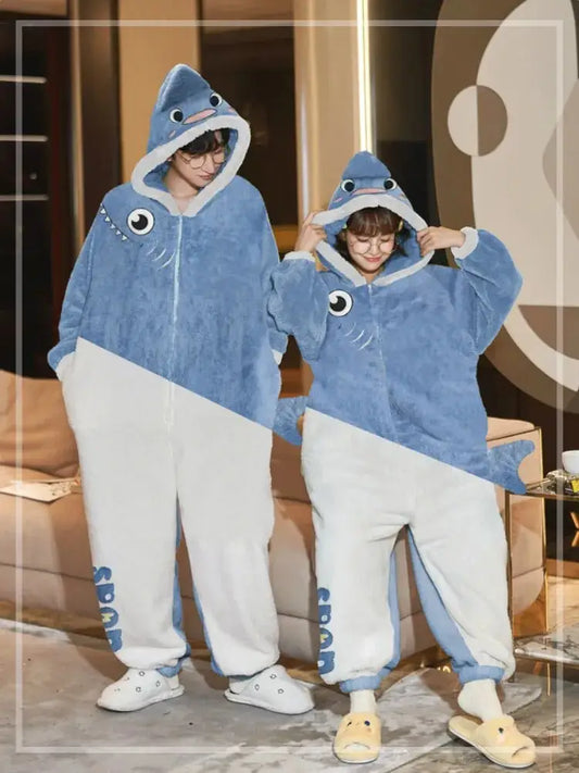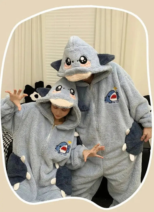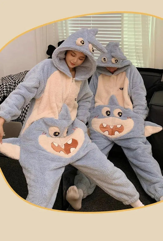 A shark onesie is a full-body jumpsuit made from ultra-soft fleece or flannel, designed to resemble the most iconic apex predator: the shark. With features like dorsal fins, toothy hoods, swishy tails, and chonky silhouettes, our onesies are built to bite back against boring pajamas.