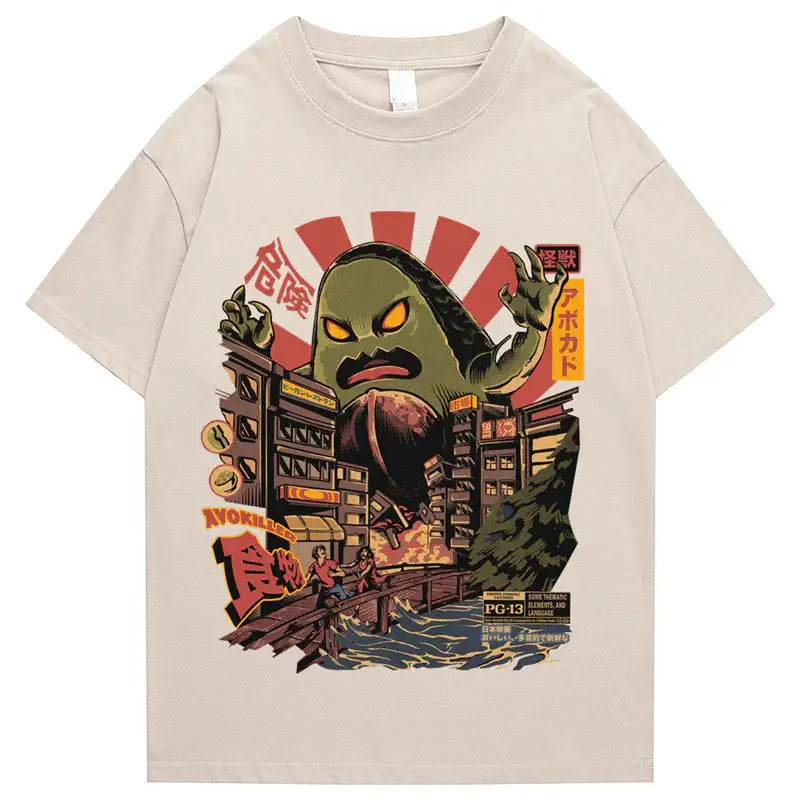 The Avokiller Monster T-Shirt connects pop culture with traditional Japanese aesthetics. Inspired by the iconic kaiju genre, this shirt showcases a monstrous avocado character, blending humor and creativity. It reflects Japan's love for unique designs and storytelling, making it a perfect piece for fans and fashion lovers alike.