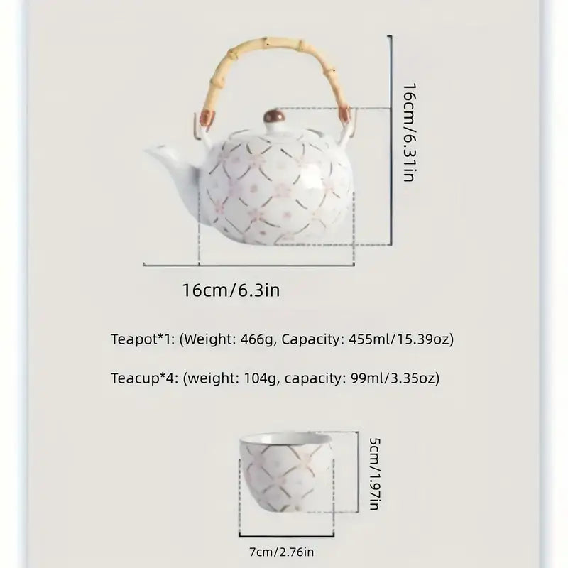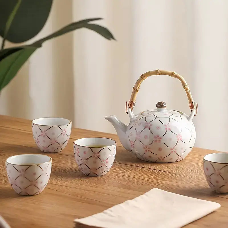 Crafted from sturdy ceramic, this teapot set features a charming bamboo handle for a comfortable grip. The delicate sakura designs enhance its beauty. Perfectly sized for intimate gatherings, it includes a teapot and four matching cups. Elevate your tea experience and order your set today!