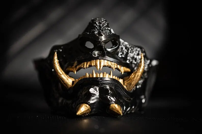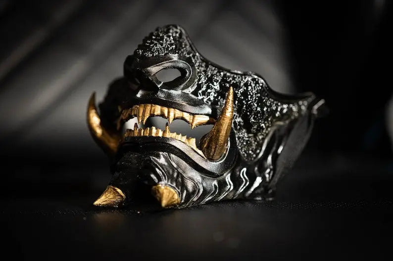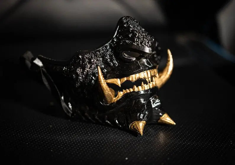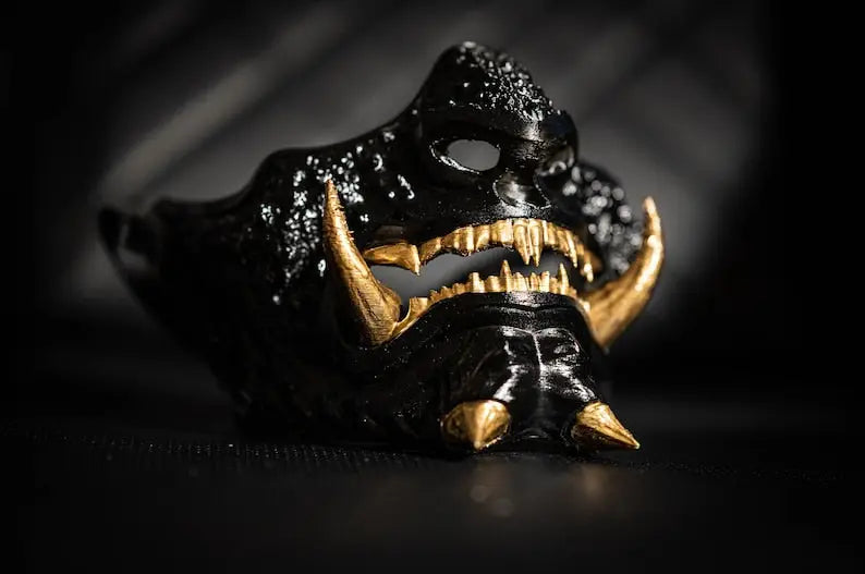 The 'Black & Gold Oni Samurai Half Mask' draws inspiration from Japanese mythology, where oni are seen as protectors against evil spirits. These masks are often featured in traditional festivals and performances, symbolizing strength and courage. Wearing this mask connects you to a rich cultural heritage that celebrates bravery and honor.
