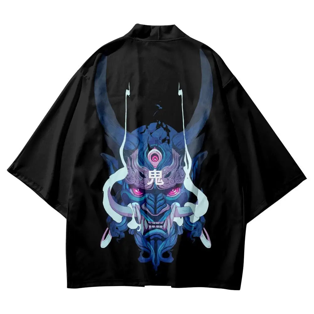 The haori is a traditional Japanese jacket that dates back to the Edo period. It is often worn over kimono for added warmth and elegance. Featuring a striking blue oni design, this haori not only showcases Japanese artistry but also connects wearers to the rich lore of oni, symbolizing strength and protection.