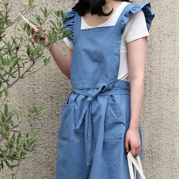 The Japanese apron, or 'kappougi,' has a rich history dating back to the early 1900s. Traditionally used in households, it protects clothing during cooking and chores. This modern version incorporates elegant ruffle sleeves, blending cultural significance with contemporary style, making it a unique addition to any kitchen.