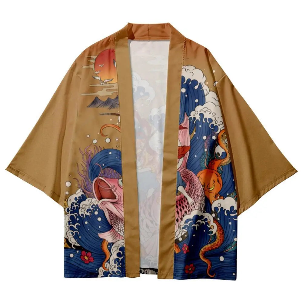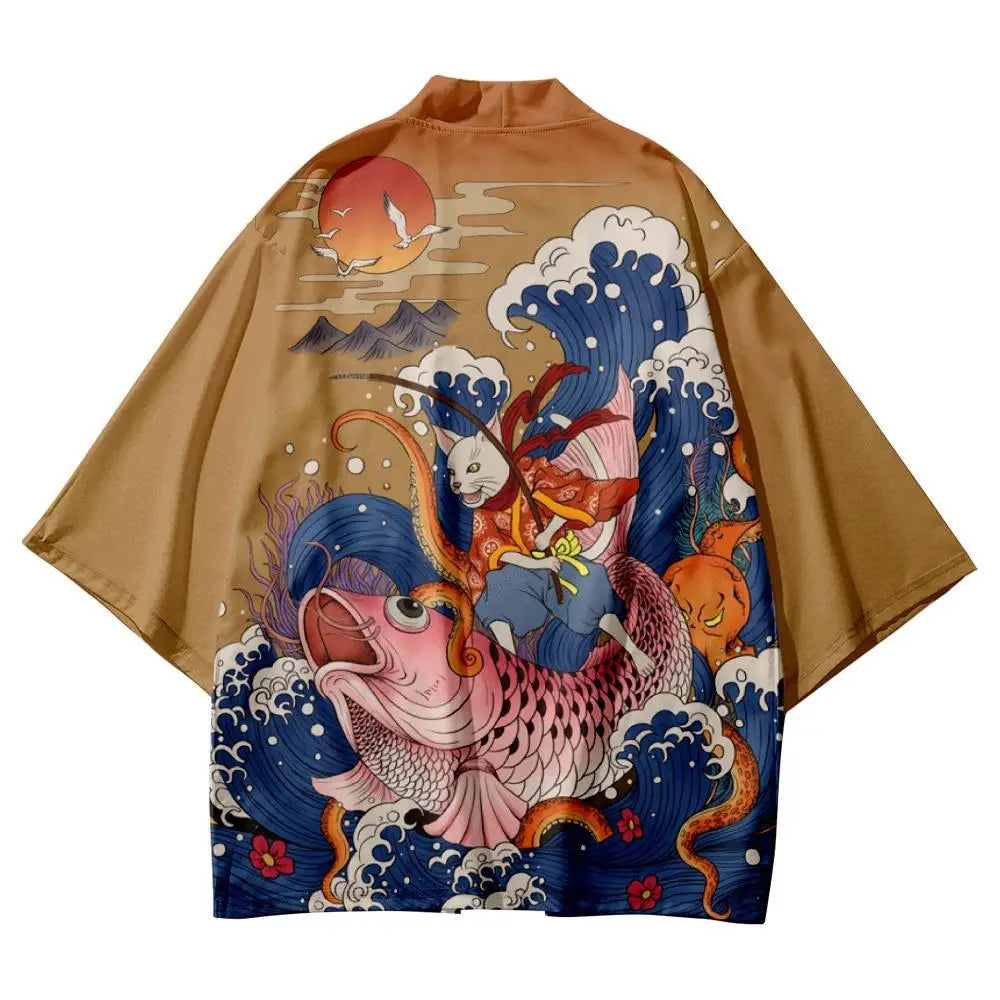 The Crazy Fishing Cat Haori is more than just a jacket; it reflects the charm of Japanese culture. Traditionally, haoris were worn by samurai for warmth and elegance. This piece showcases colorful imagery of a cat fishing amidst waves, blending modern playful art with deep-rooted history.