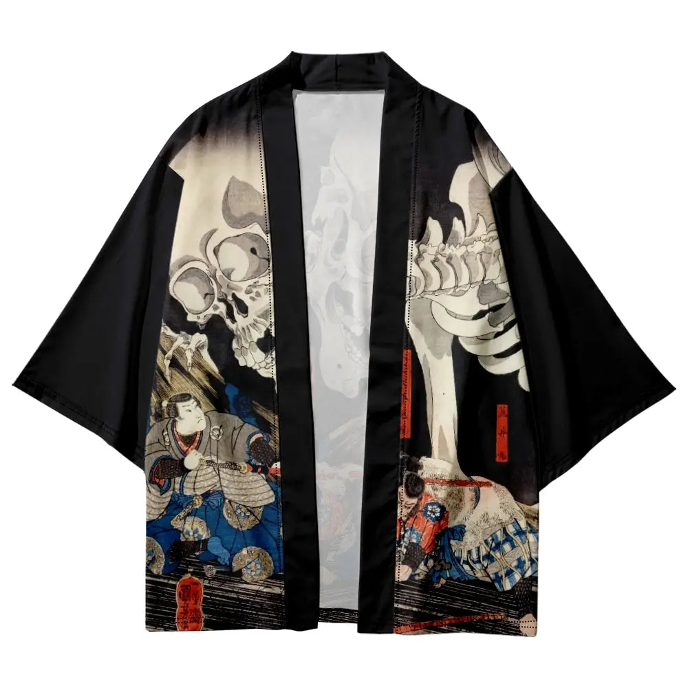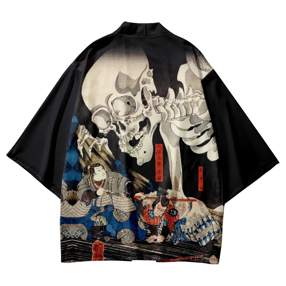 The Gashadokuro Haori draws inspiration from Japanese folklore, specifically the legendary giant skeleton. This mythical being is said to wander at night, adding an aura of mystery to the garment. Wearing this haori connects you to centuries-old tales, making it a unique fashion choice.