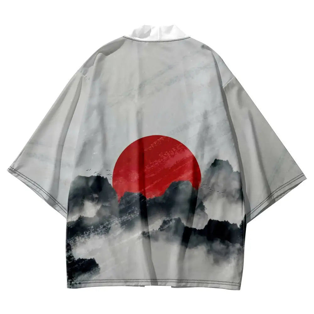 This Haori is made from lightweight, durable polyester, offering both comfort and ease of care. Available in sizes S to XXL, it ensures a great fit for everyone. With its stunning design depicting a sunrise over mountains, it's perfect for both special occasions and casual outings. Shop now!