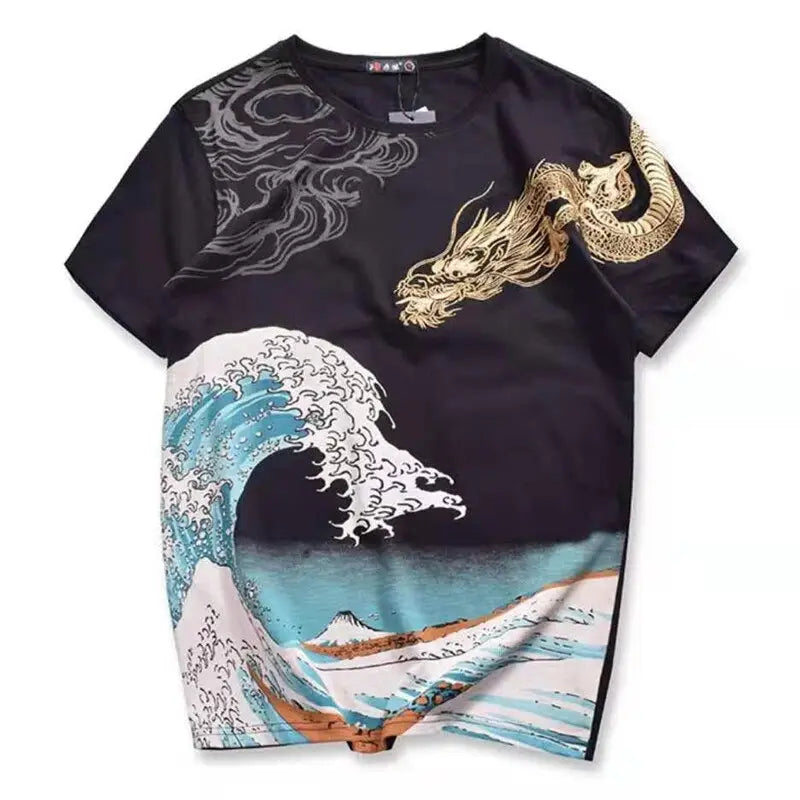 The Kanagawa Wave Dragon T-Shirt beautifully reflects Japanese culture, merging traditional art with modern fashion. This design draws inspiration from the iconic woodblock print, 'The Great Wave off Kanagawa' by Hokusai. The dragon symbolizes strength and resilience, making it a perfect wear for those who appreciate Japanese heritage.