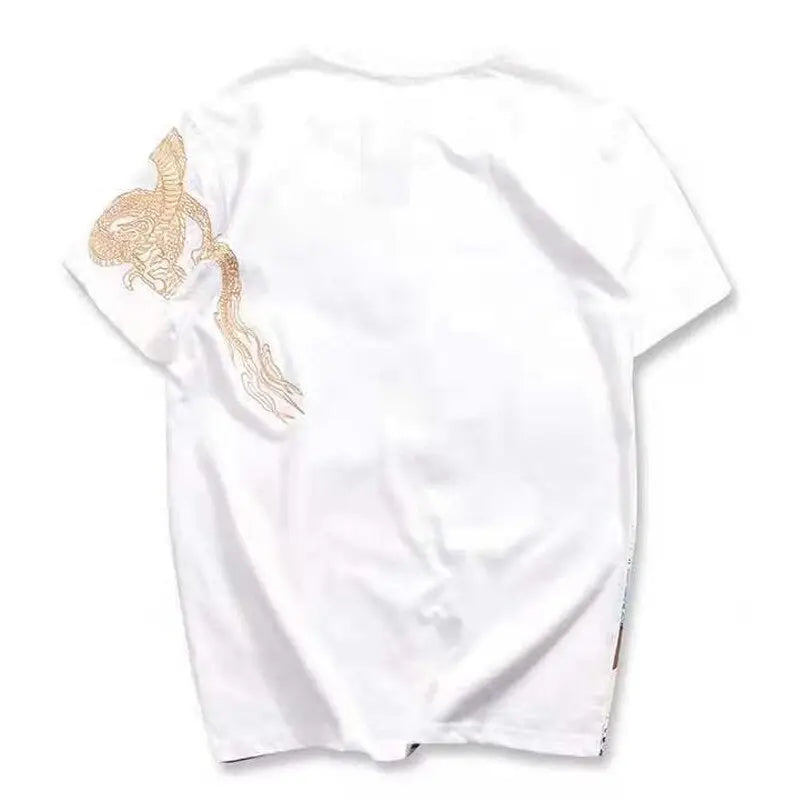 Crafted from high-quality cotton, this t-shirt is soft, durable, and easy to wear. The intricate embroidery showcases a dragon amidst crashing waves, making it a unique piece for casual outings. Choose your size and color, and add this stylish t-shirt to your collection today!