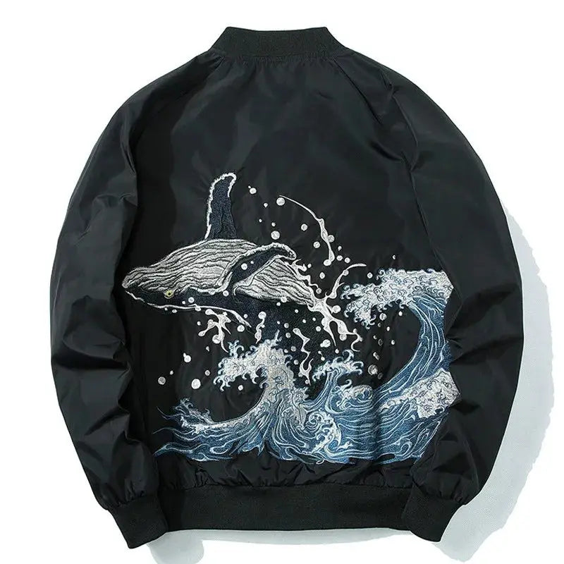 Made from high-quality polyester, this bomber jacket is designed for comfort and durability. Its lightweight fabric makes it suitable for various weather conditions, while the striking whale and wave embroidery adds a unique touch. Check the size guide below and grab yours today!