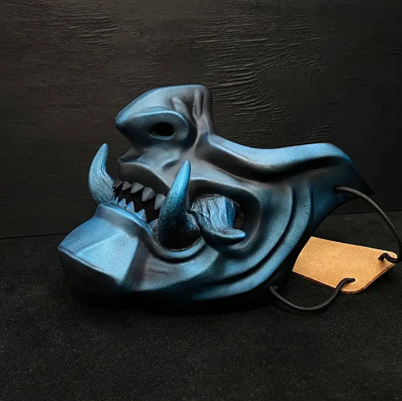 Crafted from high-quality PUR resin, this mask is lightweight and comfortable for extended wear. The genuine leather elastic band ensures a secure fit for all sizes. Its intricate design, complete with sharp teeth and horns, makes it a striking accessory. Add this unique piece to your collection today!