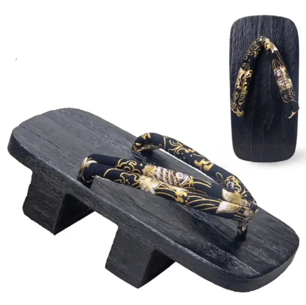 The geta sandals represent a rich aspect of Japanese culture. Traditionally worn by samurai and geisha, they elevate the feet and keep them clean. This pair features a stunning navy and gold pattern, reflecting the beauty of Japanese motifs. Experience a piece of history with every step.