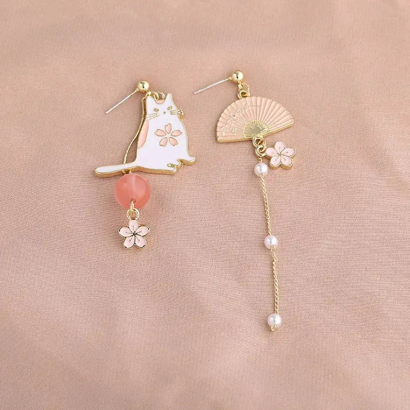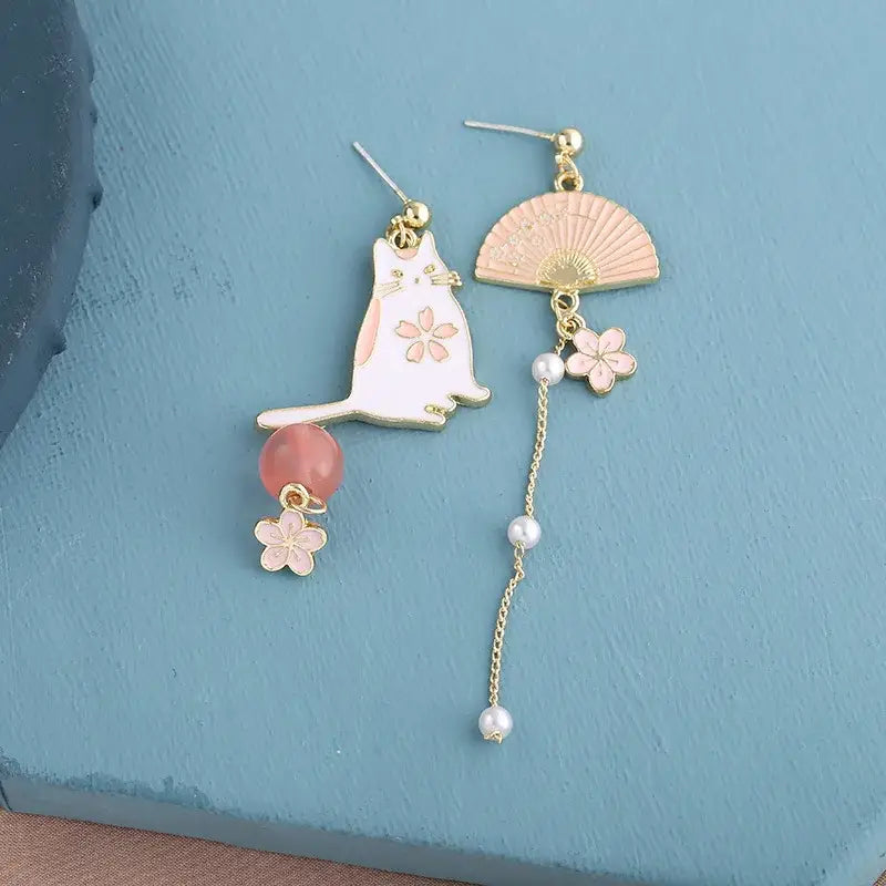 Crafted from lightweight alloy, these earrings are designed for comfort and style. The cat motif, paired with a decorative fan and pearls, adds elegance to any outfit. Enhance your collection today with these beautiful, culturally inspired earrings!