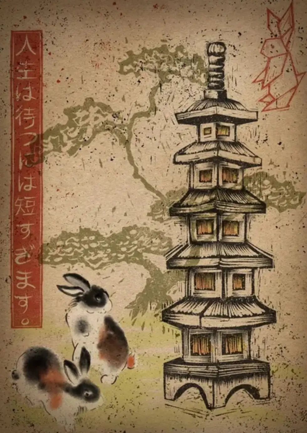 The Rabbit Temple Vintage Poster beautifully represents Japanese culture with its depiction of a pagoda and rabbits, which symbolize peace and prosperity. This artwork incorporates traditional elements, such as kanji characters, offering a glimpse into Japan's artistic heritage. Ideal for those who appreciate Japanese aesthetics, this poster enriches any space.