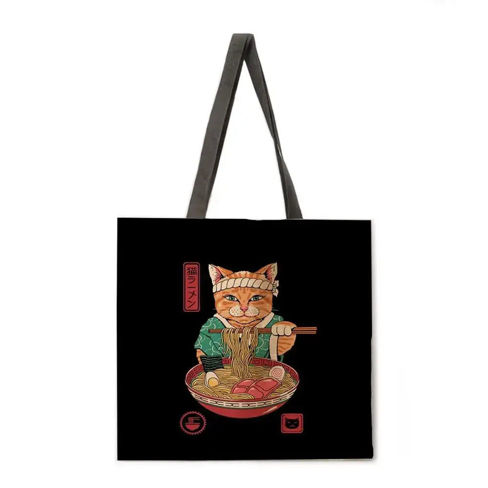 The Ramen Cat Tote Bag merges two beloved aspects of Japanese culture: cute cats and delicious ramen. Cats symbolize good fortune in Japan, while ramen represents comfort and tradition in Japanese cuisine. This bag is a fun accessory for fans of Japan's culture and culinary delights.