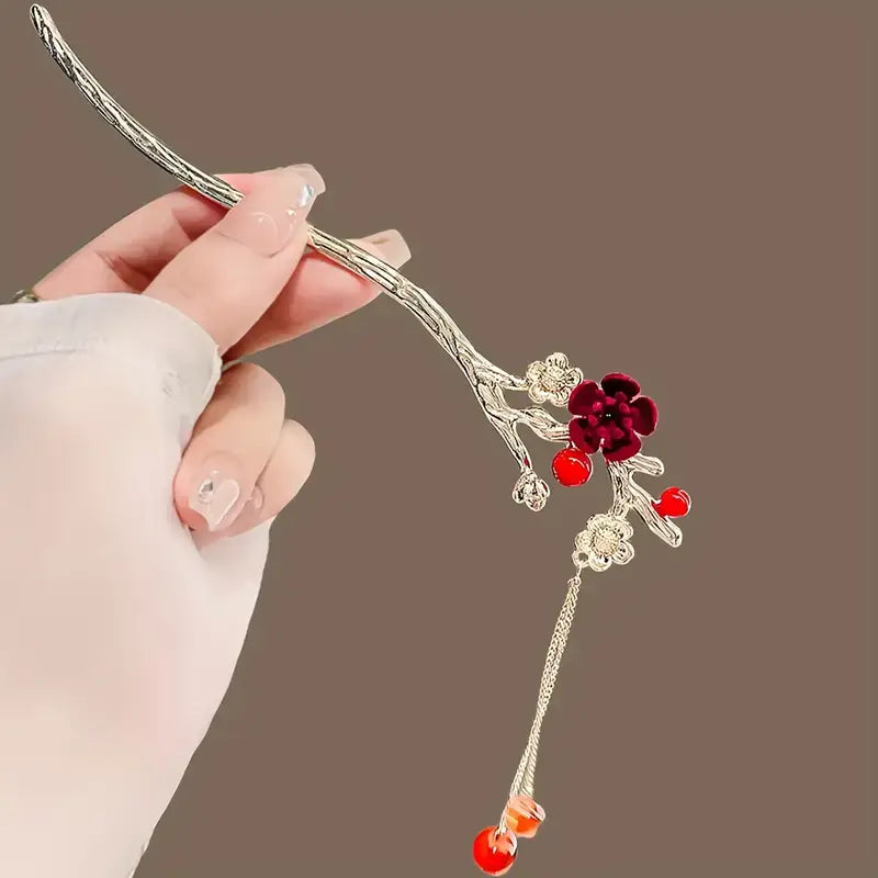 The Red Sakura Kanzashi is crafted from high-quality alloy, ensuring durability and a beautiful shine. Its lightweight design allows for easy use in various hairstyles. With its intricate blossom details and dangling chains, this hairpin adds elegance to any look. Enhance your collection today!