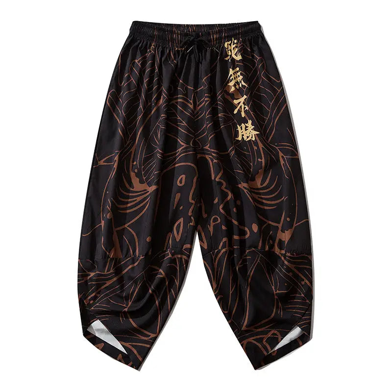 Crafted from high-quality polyester, these pants offer a lightweight feel and easy movement. The elastic waistband ensures a comfortable fit, while the unique gold kanji design adds a sophisticated touch. Elevate your wardrobe with these stylish pants—order now to embrace culture and fashion.