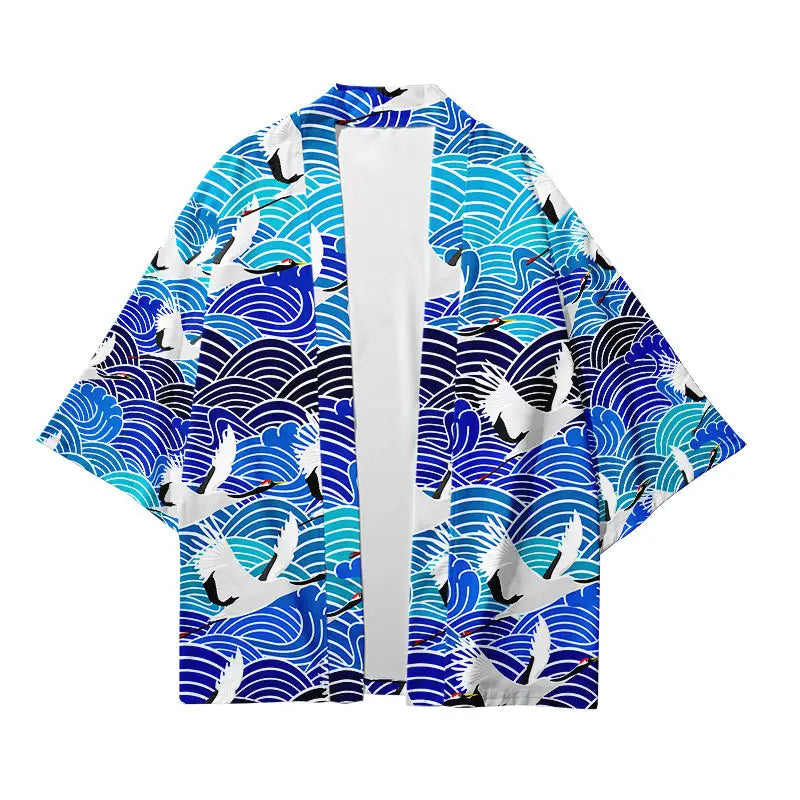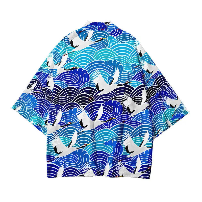 The Haori is a traditional Japanese jacket, often worn over kimonos. Its unique designs, featuring cranes and waves, reflect Japanese artistry and cultural significance. Cranes symbolize longevity, while waves represent peace. This makes the Sea Waves Flying Cranes Haori not just clothing, but a piece of heritage.