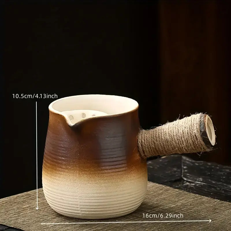 Crafted from durable ceramic, the Takara Kyusu Teapot features a 180 ml capacity, ideal for enjoying tea alone or sharing with friends. Its rustic brown gradient and twine-wrapped handle provide comfort and style. Discover the essence of Japanese tea culture with this elegant teapot.