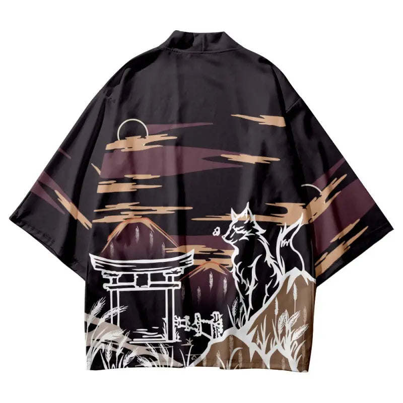 Crafted from breathable lightweight polyester, this haori offers a relaxed fit, available in sizes S to XXL. Its stunning design features a serene landscape with a fox and torii gate, making it ideal for layering. Embrace elegance by adding this unique piece to your wardrobe today!