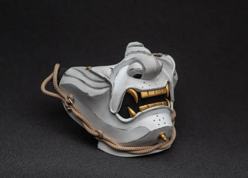 This 'White Ghost of Tsushima Samurai Oni Mask' is made from durable PLA resin, ensuring both strength and a lightweight feel. It features a comfortable cotton strap for easy wear. With its unique design and golden accents, this mask is an excellent addition to any collection. Explore your inner samurai today!